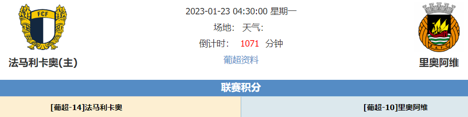 1、2022-23赛季葡萄牙足球超级联赛第17轮继续打响,法马利卡奥主场迎战里奥阿维。葡超联赛共18支球队,以主客场双循环作赛,联赛前3名参加下赛季欧冠联赛,4-5名参加欧会杯小组赛,倒数第3名参加保级附加赛,榜尾的2支球队直接降级。法马利卡奥是葡超传统中游份子,球队本赛季迄今表现糟糕,目前5胜2平9负积17分排名葡超第14位,不过球队近期状态不错,上轮联赛主场2-1战胜维泽拉,迎来联赛2连胜。