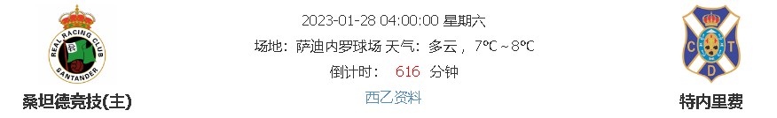 北京时间2023年01月28日04时00分,西乙2022-2023赛季第25轮比赛,桑坦德竞技vs特内里奥,西乙联赛两支中下游球队在本轮直接对决,双方目前均遭遇严峻的降级危机急需积分稳固位置,本场比赛胜利天平会倾向哪一方呢?让我们一起期待!