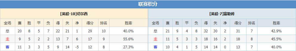 在本赛季20轮赛事过后,传统豪门切尔西只取得8胜5平7负的战绩排名联赛第10,球队在本赛季的表现其实也未如理想。不过,幸好当前联赛进程刚过半,与第四名的曼联有10个积分差距的车仔仍然存在着冲击欧战的可能,因此战意方面理应毋庸置疑。而在本赛季坐镇主场的9场联赛比赛,切尔西取得了5胜2平2负的表现,主场状态相比此前几个赛季明显下滑不少~