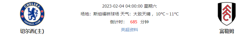 北京时间2月4日的凌晨04点00分,英超赛事的第22轮比赛即将迎来一组全新的角逐!——传统豪门切尔西将会坐镇斯坦福桥球场迎来“升班马”富勒姆的挑战!本赛季表现十分不俗的富勒姆能否迅速调整状态反客为主?还是近况得到明显好转的切尔西能够借助主场之势力克对手?