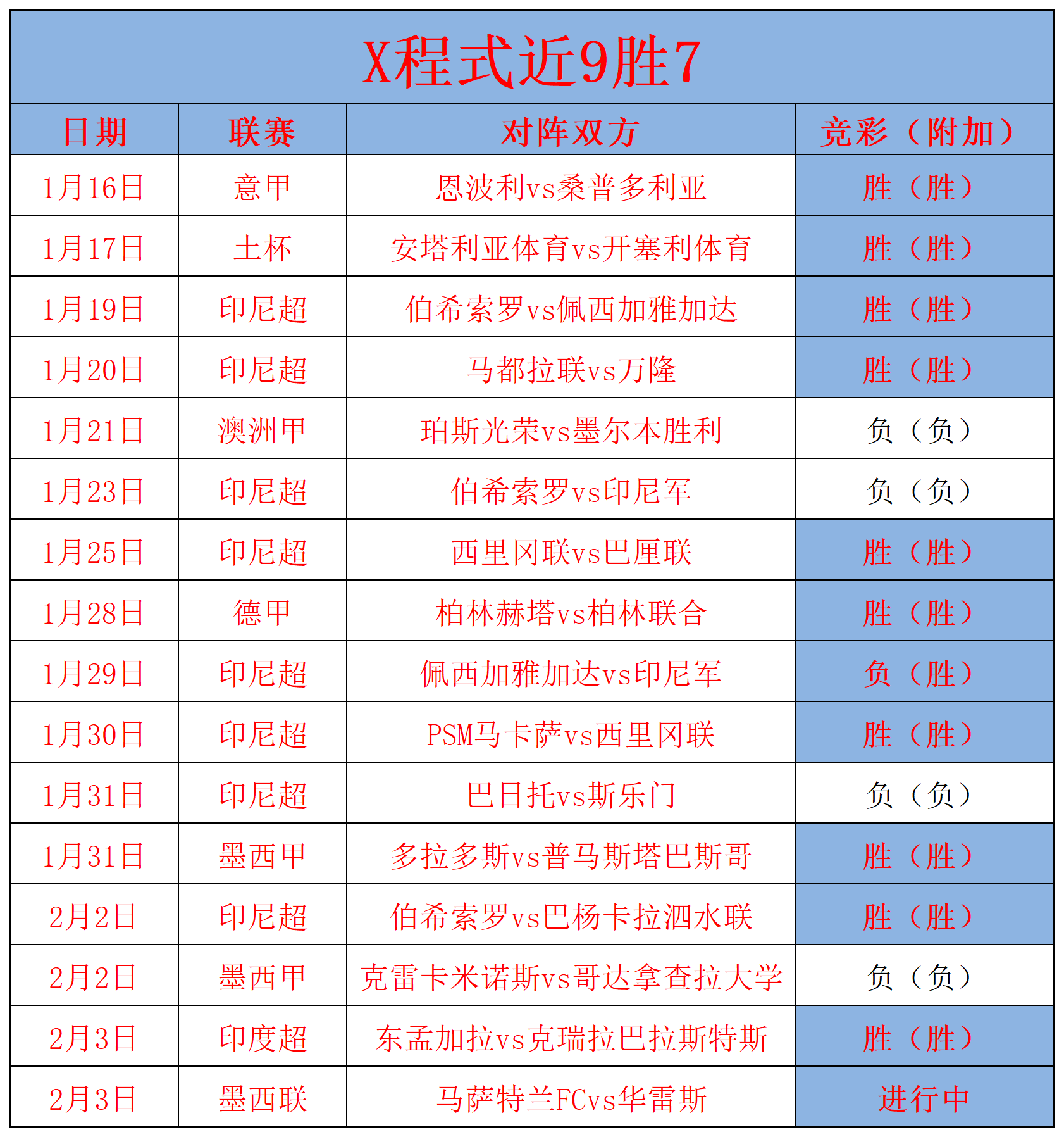 2、近期战绩:昨天分享了2场比赛,第一场的印尼超已准确打出,第二场的墨西联在进行中,近期战绩9胜7,继续保持稳定。