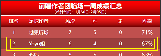 Hello,各位粉粉!我是Yoyo呀,小女子在本报大家庭已经进驻良久,粉丝数在近段时间已经突破1.4w,感谢各位粉粉的支持呀!对于本人,近期整体战绩正值至佳的状态,其中近期核心临场取得不俗战绩,而公推方向同样表现棒棒哒!看球赛是每日必修,对球赛有自己独到的见解和分析,擅长拆解赛事数据,稳中求胜,欢迎友友们持续关注哦~