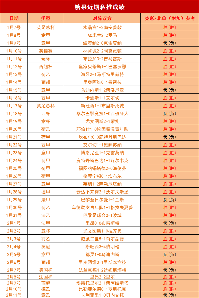 昨天赞赏的意乙在多打一人的情况下被对手进球,比赛结束前进球又被吹,赞赏遗憾定格于3连胜!近期赞赏33胜24!糖果已连续4周位居临场周榜前2名!2023年1月成绩出色,共推23期30单,全部为均注,迎利率为1058%!2月我们继续努力!欢迎大家打赏或包周支持!我们按计划稳定迎利!