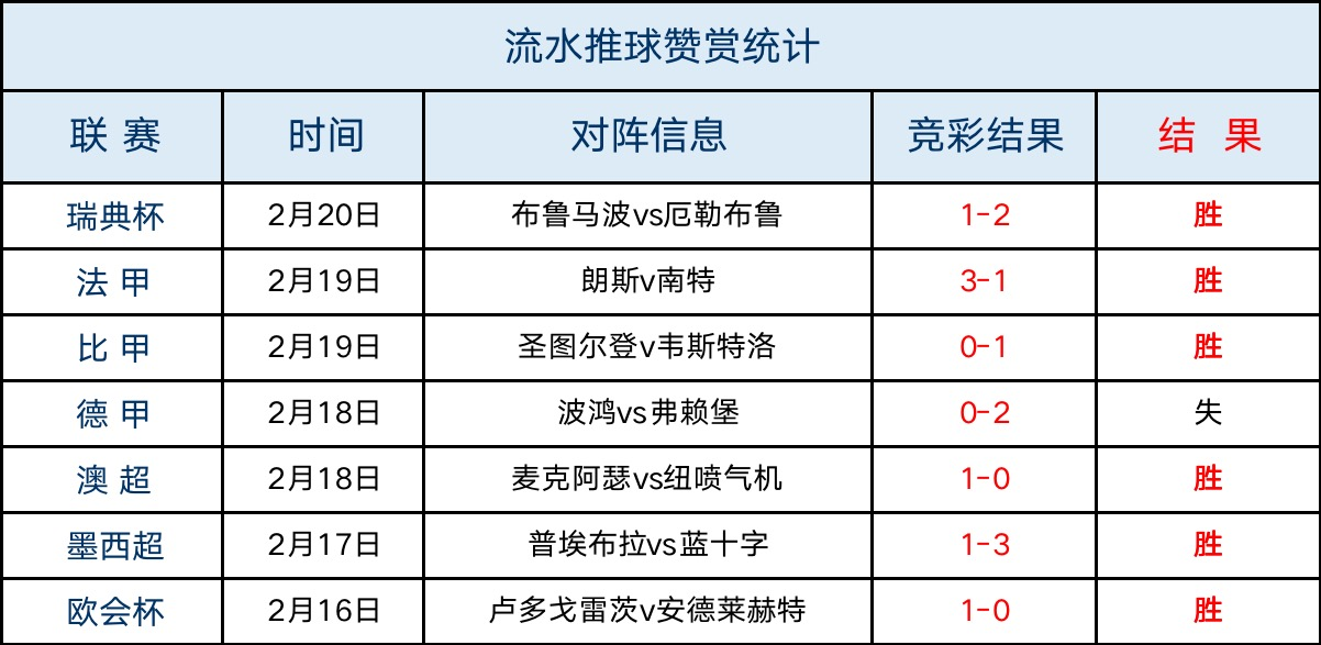 赞赏回顾:流水赞赏连战连捷,赞赏近7胜6,昨天布鲁马波1-2厄勒布鲁,比赛方向顺利跑出。过往赞赏曾有过156天总体胜率近7成(不含走)、连续六周占据榜首的辉煌战绩,长期稳定,今天继续一起采摘果实!!!