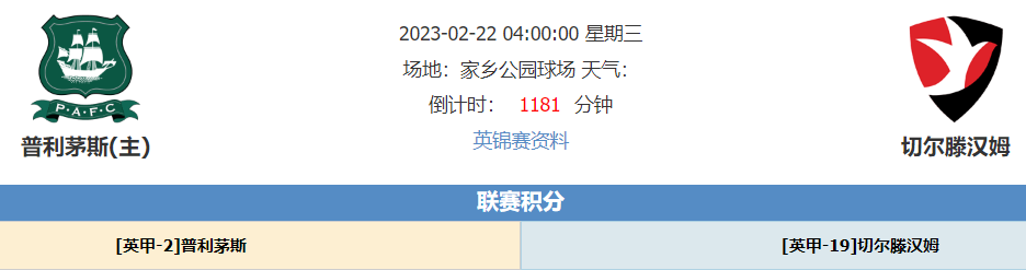 北京时间2月22日04:00,2022-23赛季英格兰足球锦标赛半决赛打响,普利茅斯主场迎战切尔滕汉姆。普利茅斯在各方面均占据优势之下,本场初始力度过于造势,后市则增加打出回馈,这对球队大胜十分不利。