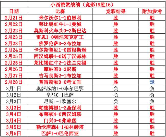 小西心语:昨日赞赏继续迎来双胜!取得5连胜!赞赏的巴伦西亚方向和勒沃库森队都是完美打出。今天的比赛质量还是十分不错的,将会选出1~2场,继续冲击全胜!冲冲冲!