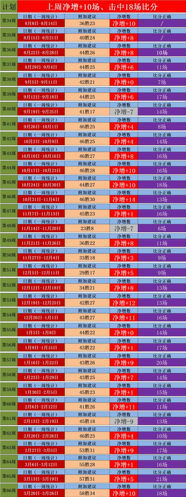 2、上周净增+10,已经连续5周增长,近18周有17周保持净增长,上周预测18场比分正确,持续的保持了高效的稳定。