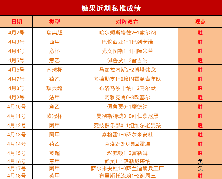 昨天赞赏的英甲告捷!近期赞赏17胜15!糖果已连续2周排名临场周榜榜首!2023年迄今每月均保持正向取胜!2022年整体实水也是正向几十手!欢迎大家打赏或包周支持!我们按计划稳定取胜!