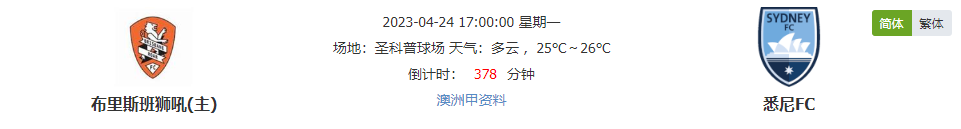 北京时间2023年04月24日17点00分,季后赛继续火热进行中,双方实力相差悬殊,布里斯班狮吼此役能否抵挡悉尼FC的进攻?悉尼FC能全身而退?