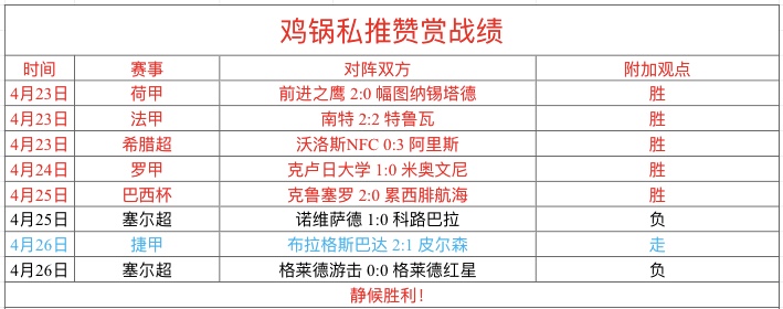 周三私推赞赏2场,结果1走1负,塞尔超差一个球,很可惜,赞赏近7胜5!总进球数1场没有打出,依然差一个球,判断方向依然被数据误导,方向错误,需要深刻总结分析!今日加油,全胜搞起来!