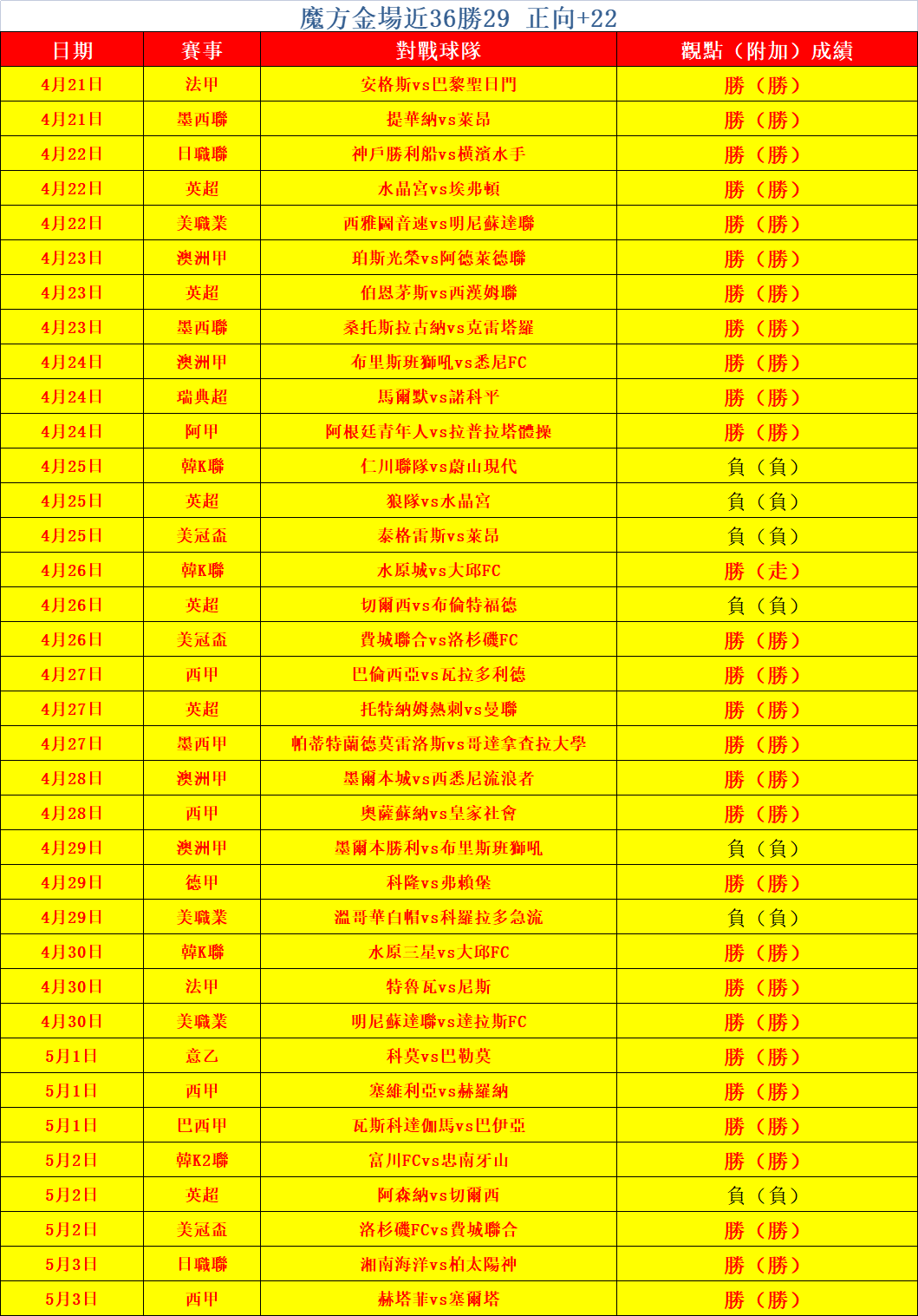 魔方昨日再取正值,金場全勝!5月連續三天取得高正向成績,昨日早場金場拿下,五大聯賽專場清版全勝,美賽專場正在進行歡迎關注。金場成績持續穩定高效,近36勝29!接下來魔方將會不斷努力務求精益求精!今日對歐賽以及美賽進行深研。