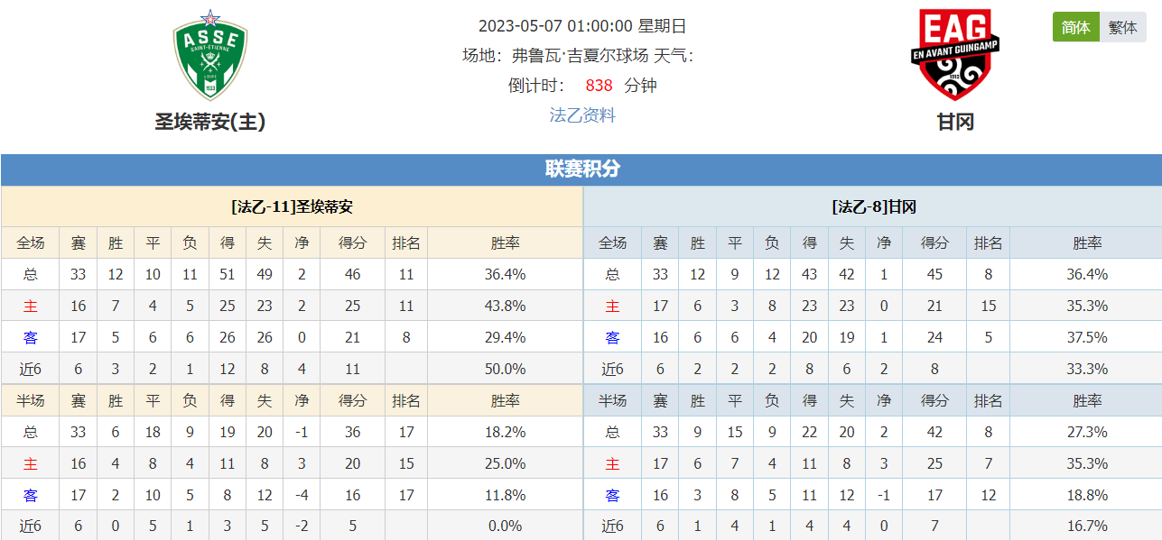 看点:圣埃蒂安近期连续2场比赛不胜,此役主场作战能否重返胜轨?甘冈上一场比赛主场3-1大胜急需要积分保级的拉瓦勒,此役作客能否延续出色表现?