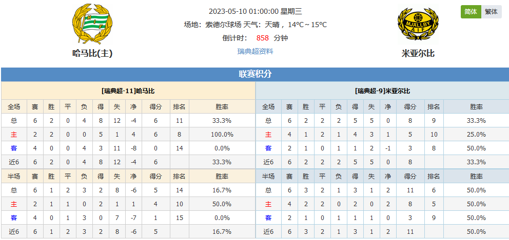 北京时间05月10日01:00,2023 瑞典超级联赛,哈马比vs米亚尔比,哈马比相比于上赛季,似乎有些下滑,今晚坐镇主场能否找回状态取得一场胜利呢?