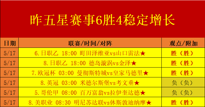 昨日24战收获13场胜利方向,整体表现重新回到50%以上的胜利增长轨道,其中早场8战日职乙大包围赛事拿下6场优秀胜利观点分享,而晚上的欧赛虽然脚步有所放缓,但其中焦点欧冠杯赛事曼彻斯特城vs皇家马德里的比赛成功拿下也是十分明确,而次日的美赛以五五开的表现给与了充足的增长支持!而作为主要板块支撑的五星赛事合计收获了6胜4的增长表现,为笔者胜绩的复苏之路给与了充足的基础支撑!