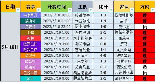 昨天数据表现惊人,整体12胜9!昨天数据中,早场的表现不错,整体4胜3,其中丹麦甲的表现比较刺激,客队在下半场3分钟内连进2球顺利逆转比分,非常的给力,进球数也完美的拿下!而瑞典杯也完美的打出,非常的给力!当然土超的表现是亮眼的,主队完美的打出对应的方向!晚场的表现出色,4场全部完美的打出,非常的给力,尤其是英超的表现,进球数完美的拿下!欧罗巴的表现也非常的出色,2场都完美的打出,比较可惜的是尤文在加时赛不敌对手,无缘决赛,比较可惜!夜场的表现不错,其中欧会杯一胜一负表现平稳!而阿甲的表现非常的给力,主队完美的拿下数据,非常的给力!