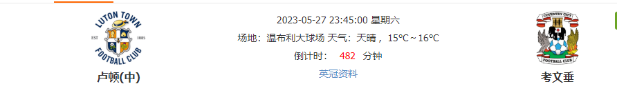 北京时间2023年5月27日23:45,英格兰足球冠军联赛,考文垂中立场对战卢顿,本场比赛是考文垂拿下胜利?还是中立场作战的卢顿保持不败?数据对于两队又有如何倾向?近9胜7的小明给大家带去精准分析,希望有一个不错的结果。