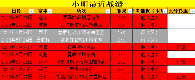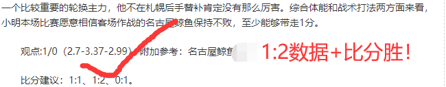 早场1场日职+昨天2场比赛共计3场比赛全部成功拿下!近期取得9场比赛胜7的佳绩,并且昨夜+今天早场合计豪取1670%比分!小明在两周内达成十五连胜的成就,值得大家长期关注。早场日职札幌冈萨多1:2名古屋鲸鱼,本场比赛成功收下客队方面+970%比分!札幌周中日联杯全主力击败横滨水手,而名古屋全替补出战,体能方面客队占优势,所以这场没理由选择状态主队。昨第一场:阿尔梅勒城2:1埃因霍温FC,本场比赛拿下数据和700%比分!在前80多分钟阿尔梅勒城一直在压着客队在踢,客队主力门将伤缺,果然没有抗住主队的进攻,连丢两球,不过小明认为客队的进球有些商榷。客队全场只有那么1次传中,主队后卫居然禁区内手球直接拦截,似乎有点找进球数大的意图,不过结果还好,主队93分钟反超比赛,小明这场不仅打出主队方面,顺带跑出2:1比分!昨第二场:索肖0:1梅斯,这场比赛观点拿下,附加返。梅斯早早来到1个数据位置,显然选择他们客胜是稳妥的。而小明文章中给大家提到数据不明朗的波尔多果然客场直接0:1败北,梅斯追平3分劣势,把升级悬念留在了38轮。梅斯这场70分钟就多一个人作战的情况下,没能打入第二个进球,也有点小可惜,不过总体结果依然不错!希望今天也能够分析正确,给大家带去理想的赛果。