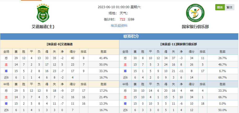北京时间6月10日01:00,埃及超第31轮赛事艾德瀚德vs垠行俱乐部,艾德瀚德四连败难以止颓,他们能否在此役捍卫主场重夺胜绩?垠行俱乐部境况越来越好,与对手正好是相反境况,此番挑战是否已做好准备?