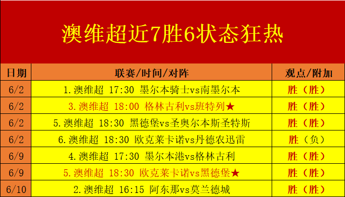 昨日已完成的8场比赛合计取得了5胜1走2负的优秀成绩,单日进度取得胜+3的精彩收获!本日早场赛事澳维超领衔,在过去的2周时间里,澳维超合计拿下了7胜6的狂热增长成绩,继续通过精选的澳维超赛事组合进行周中的成绩积累,迈向更高的增长通道!