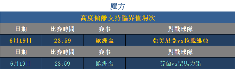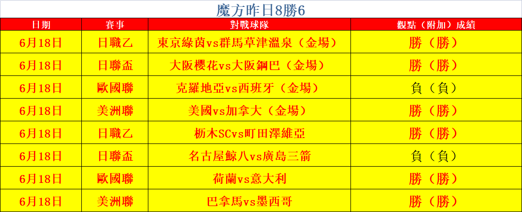 魔方昨天繼續高正值産出,整体8胜6,其中日職乙專場以及美赛专场清版全勝!接下來魔方將會不斷努力務求精益求精!今日對欧洲杯以及美賽進行深研。