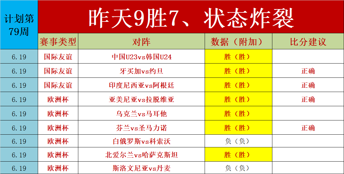 1、推演士计划第79周收官了(走不纳入统计)昨天周一状态已经开始炸裂,昨天拿下9胜7的佳绩,并且击中了4场比赛,昨天的3场国际友谊赛大获全胜,友谊赛近期的战绩23胜17,另外晚上的重点欧洲杯也拿下了6胜4的佳绩,今天周二乘胜追击,重点欧洲杯继续。