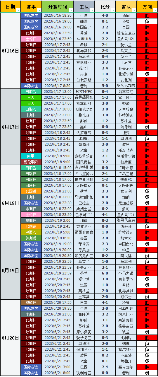 昨天数据表现不错,整体13胜7!昨天数据中,早场的表现非常的出色,3场全部完美拿下,又迎来大满贯的高光表现,非常的给力!其中中国队主队2-0完美的打出对应的方向,非常的给力!而非洲杯和麒麟杯在上半场就已经拿下数据了,非常的精彩!晚场的表现不错,整体5胜3,其中挪威终于迎来首胜,3-1大胜对手!而波兰则是比较让人无语,上班2-0领先,下半场居然被对手连轰3球逆转结果,出了巨大的冷门,也是这期欧洲杯的首个冷门结果!而比利时和苏格兰都完美的拿下数据,非常的不错!夜场的表现较差,其中欧洲杯3场全部未能打出,是夜场未能大胜的重要原因!而国际友谊则是一胜一负表现平稳!