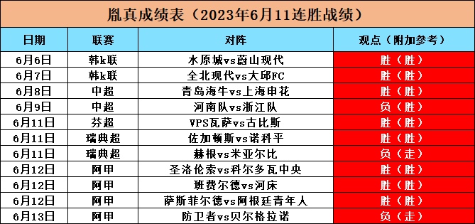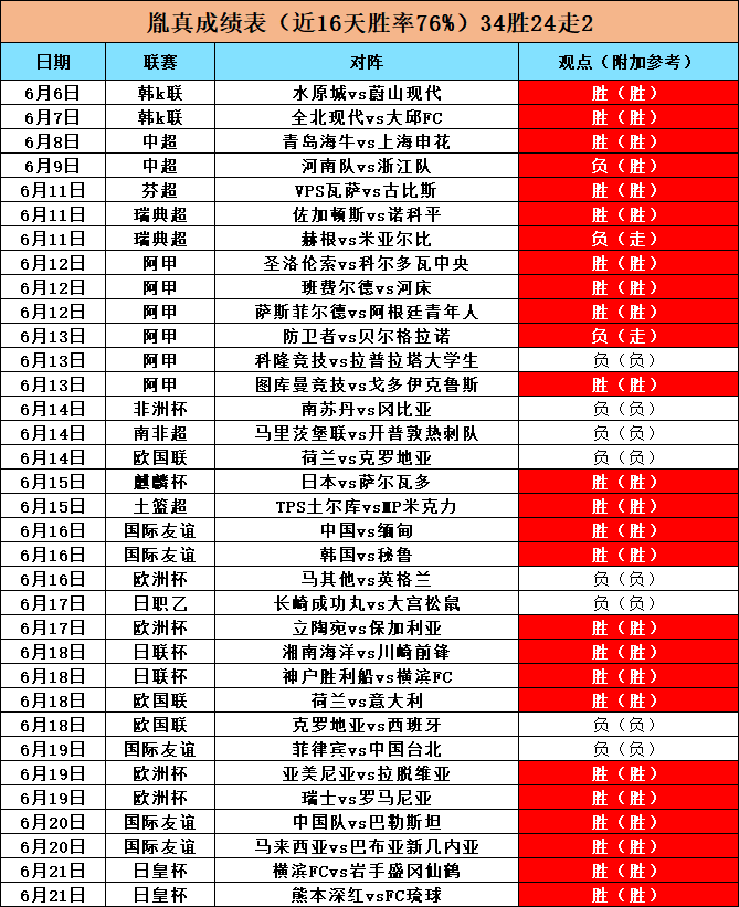 胤真近两周数据相当炸裂,6.5-6.11本周共预测7场击中6连胜走1胜率高达100%,6.12-6.18共预测20场赛事击中12场走1场胜率65%,本周目前预测7击中6场,胜率85%,期待接下来为各位老铁带来更辉煌的战绩。同时笔者也会在接下来的预测赛事当中搜索更多的外界信息来确保命中率。