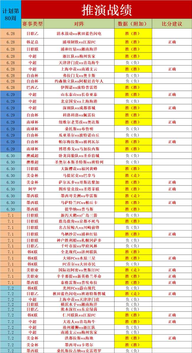 1、推演士计划第80周(走不纳入统计)早上的美洲赛事结束了,拿下3胜2的佳绩,美金杯2场全胜,墨西哥出了大冷,笔者也作了提醒的,上周又是净增长的一直,上周净增+2场,上周一共击中了21场比分,今天是新的一周,也是推演计划的第81周,晚上瑞典超继续。