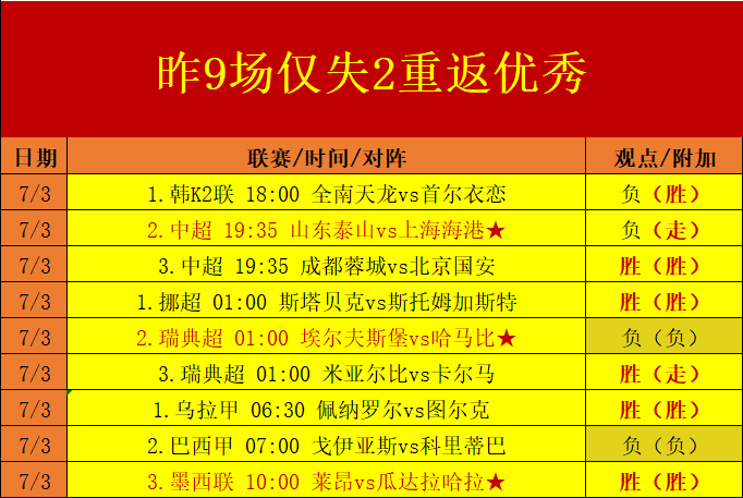 昨日已完成的9场比赛收获5胜2走2负的优秀成绩,延续了上周收官的稳定表现,收获单日胜+3的优秀成绩,交出的3个板块都分别保持着67%以上的不败精彩表现,本日先锋板块以抽取精选杯赛+芬甲组成,争取延续周一的优势起步持续扩大优势打好周中的积累基础!