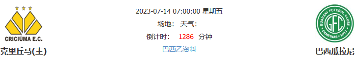 北京时间07月14日07点00分,2023巴西乙联赛第17轮的一场比赛,巴西瓜拉尼将前往客场与克里丘马展开较量。当前在联赛积分榜上,克里丘马与领头羊维拉诺瓦仅有1分之差,本轮面对客场虫巴西瓜拉尼,主队自然是志在三分。
