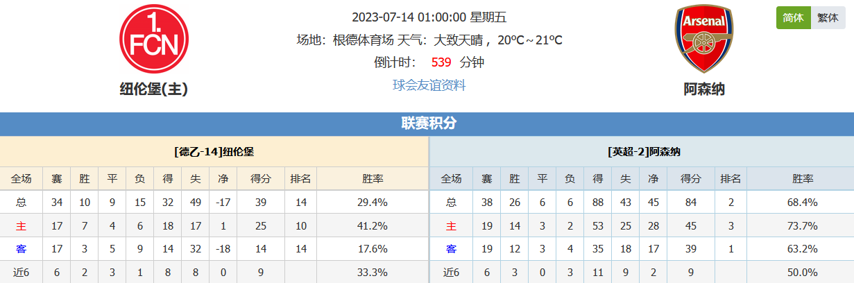 北京时间7月14日01时00分,2023年7月球会友谊赛程,纽伦堡vs阿森纳,主队一年前主场迎战阿森纳以3:5遭遇失败,为上赛季阿森纳的联赛冲击提供了不少的士气,本次继续坐镇主场迎战对手,双方的实力是否依然保持差距?让我们拭目以待!