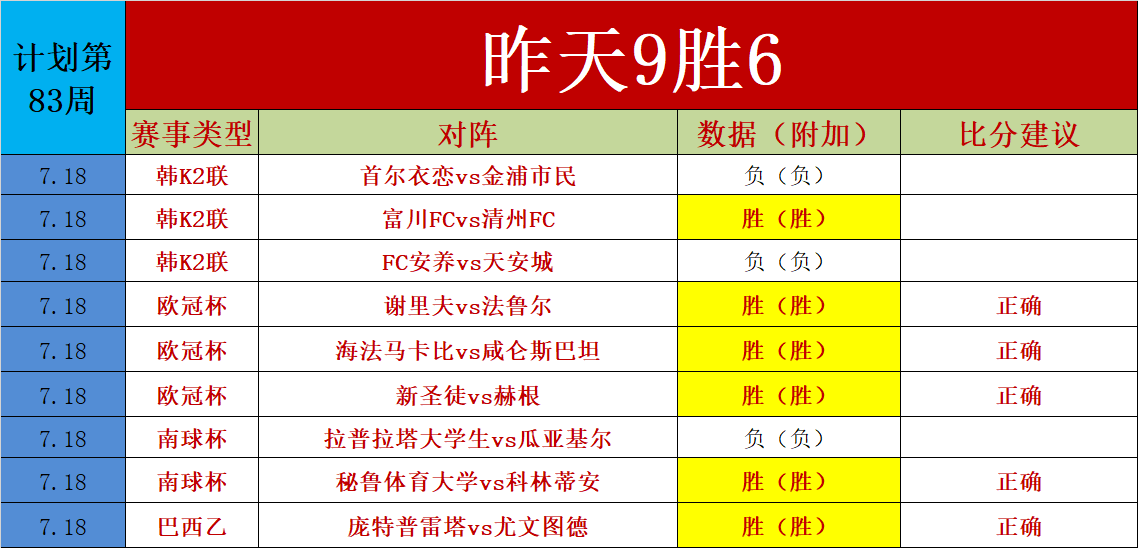 1、推演士计划第83周(走不纳入统计)早上的赛事结束了,拿下3胜2的佳绩,昨天状态炸裂,拿下9胜6的佳绩,并且击中了4场比分,值得一提的是欧冠杯,昨天的欧冠杯3场全胜,欧冠杯继续来。