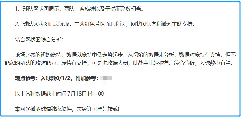 微函建议和分析思路:以新的咨询和全面的综合分析去分享给到,包括基本信息,主要的是微函对于数据的变化把握,从初始-中期-临场都会实时观察,会提示由于数据调整导致赛果的倾向,作出准确和专业的判断,敬请期待。