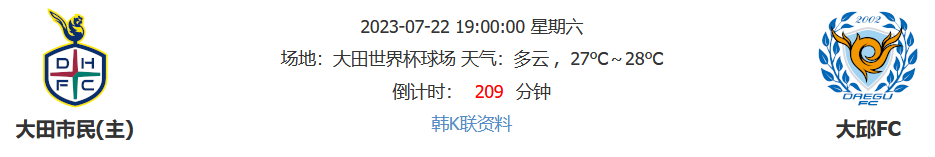 北京时间2023年7月22日19:00,韩K联2023赛季第24轮比赛,大田市民vs大邱FC,升班马近期制胜能力持续走弱,虽然已经是保级无忧但与争冠阵营拉开了差距,此番主场迎战后期发力重新回到争冠组的大邱FC,球队能否捍卫主场拿下这个价值6分的排名大战?让我们一起拭目以待!