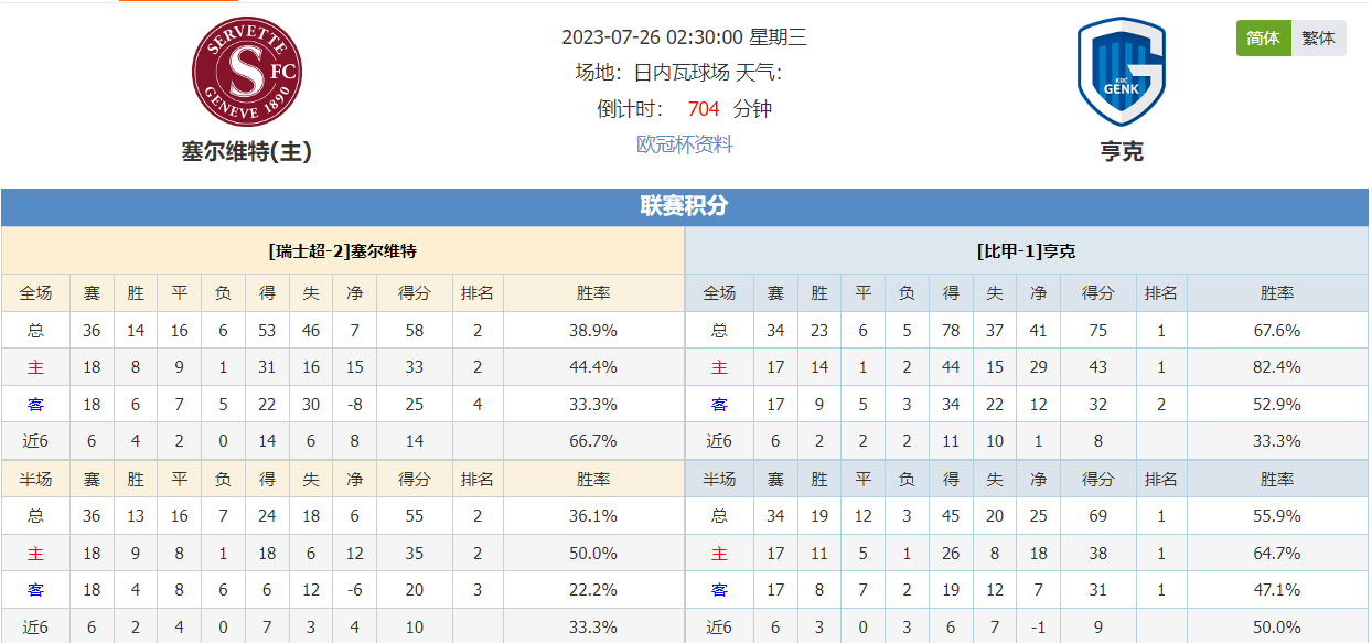 北京时间7月26日03:30,欧冠杯第2轮,亨克vs塞尔维特。塞尔维特近期状态相当火热,如今回到主场会更有优势,他们能否在此役就此晋级?亨克状态逊色不少,如今作客还有晋级机会,此役作战谁是更有作为的一方?