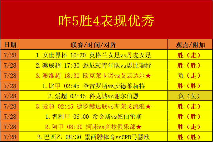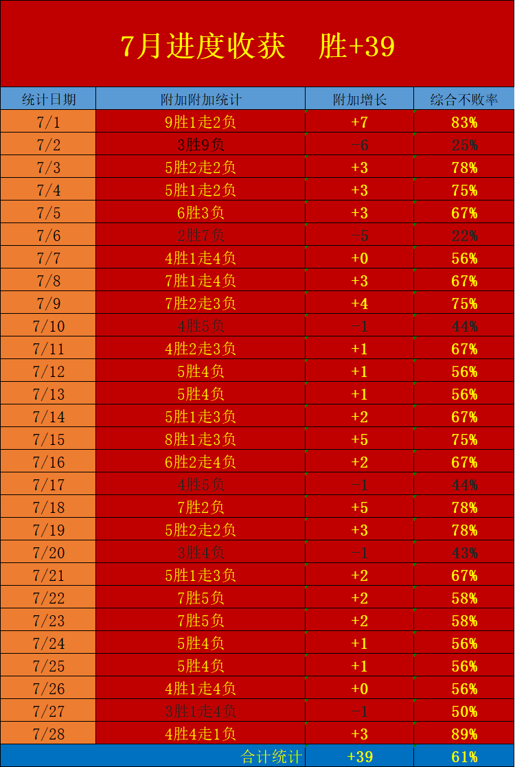 昨日交出的9场比赛取得4胜4走1负的优秀收获,单日再次拿下胜+3的精彩增长,7月已进行的28个比赛日收获了22天的胜利增长表现,合计取得了胜+39的优秀向上增长,整体7月赛程尚余3天时间,本日的中坚板块带来欧洲赛事组合出击,争取保持在持续高产的同时保持优秀的增长表现,以完美的成绩表写下7月优秀一页!