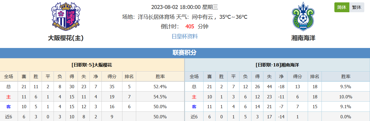 北京时间08月02日18:00,日皇杯2023赛季第四圈比赛,大阪樱花vs湘南海洋,双方目前在日职联的比赛差距较大,本次来到日皇杯一战定胜负的赛场会否意外的比赛走势?让我们拭目以待!