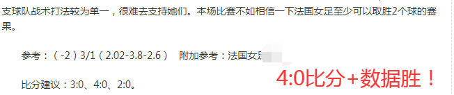 上期2场比赛1胜1小负。小明在两周内达成十五连胜的成就,常年保持命中率稳定,值得大家长期关注。法国女足4:0摩洛哥女足成功大胜跑出,并且比分正确!哥本哈根小负一半,哥本哈根给的数据还算可以,主胜是大方向,可惜哥本哈根全场围攻且打了2脚门柱,与胜利擦肩而过。希望今天也能够分析正确,给大家带去理想的赛果。