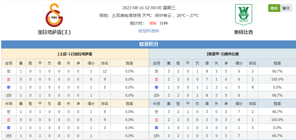 北京时间8月16日02:00,欧冠杯第3轮,奥林比查vs加拉塔萨雷。加拉塔萨雷近期状态还算稳定,如今回到主场会更有优势,他们能否在此役轻松拿下?奥林比查状态显得不稳,当下作客会十分艰难,此役作战谁是更有作为的一方?