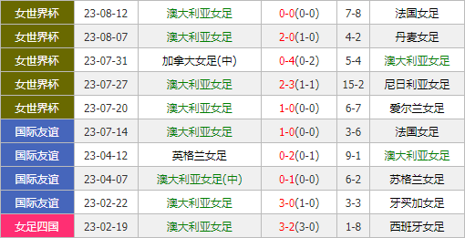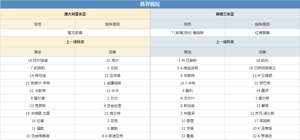 不过,在对赛双方在近年来的近5次交锋记录可见,澳大利亚女足在面对英格兰女足能够取得2胜1平2负的战绩,可以看出澳大利亚在面对对手时并不会落于太大的下风,其中还包括在世界杯开赛前曾2-0击败过英格兰,心理层面上不落下风。