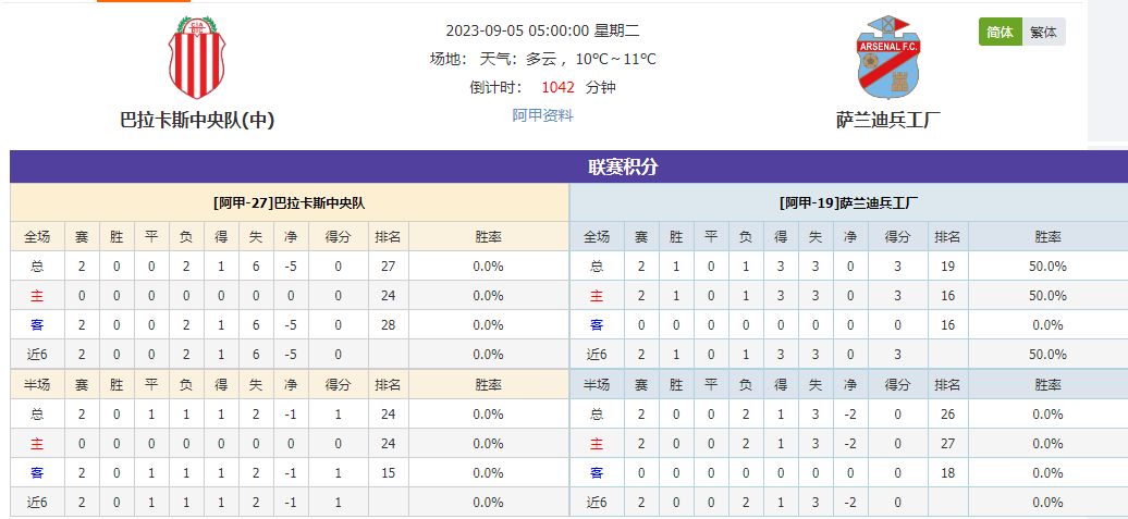 萨兰迪兵工厂上阿甲完成27场比赛,成绩是6胜12平9负,积30分,排名第23,这个赛季也是在下游,与对手是十分接近。球队目前阿甲完成2场比赛,成绩是1胜0平1负,积3分,排名第19,这个赛季仍是为保级而努力。上一场比赛是以主场身份迎战阿根廷青年人,结果萨兰迪兵工厂以3:2战胜对手,在落后的情况下完成逆转,球队表现出坚韧的态度。近10场所有比赛中,萨兰迪兵工厂取得2胜2平6负成绩,胜率20%,他们的抢胜能力还未体现出优势,毕竟当下仅是刚好取胜。