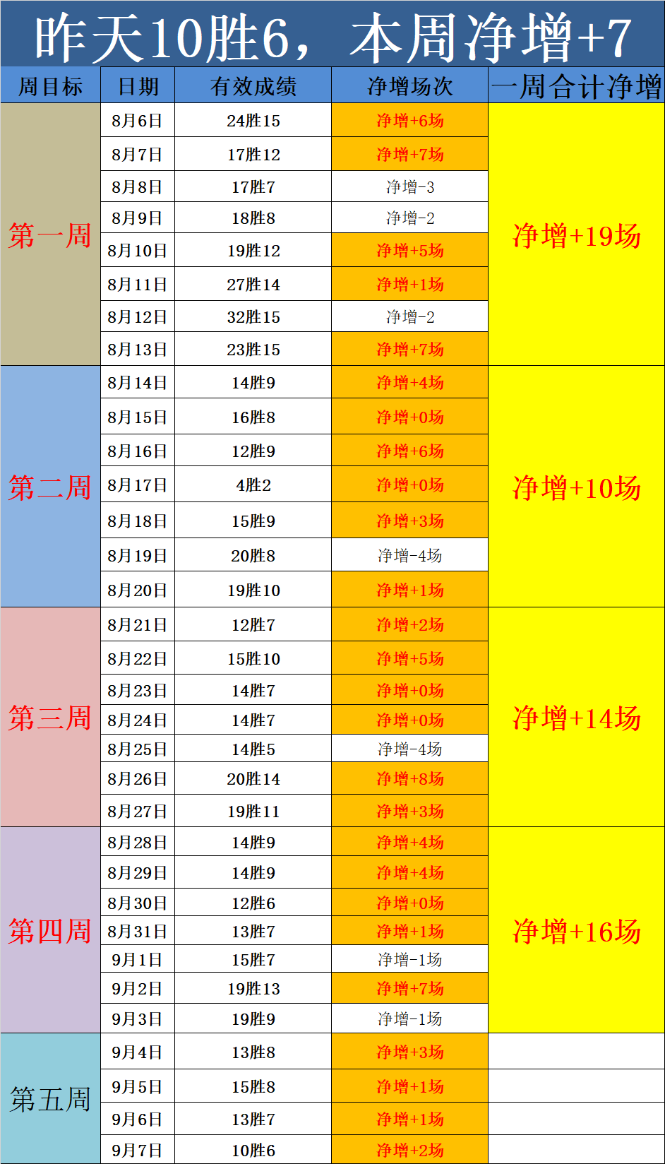 精彩分享:昨天10胜6,净增+2场,本周已经连续4天净增长了,本周净增+7场,截止目前,从8月6日至今共4周,净增长高达64场,今天我们继续向更高的目标推进。