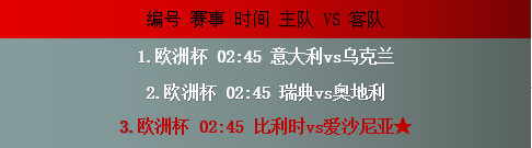 延续了周日收官战12胜10的强猛攻势,昨日已交出的8场比赛收获7场胜利观点分享,连续两天时间合计豪取20胜17正+14的优质增长赛程,其中欧洲杯的3场比赛再次取得3场全胜的优势表现,精彩的上升赛程表现不容错过,本日欧赛板块继续精选欧洲杯多场赛事组合出击,争取一鼓作气持续扩充,为9月赛程再添更多的优质净增!