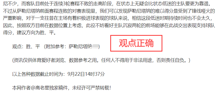 (温馨提示:观点回顾为已完场赛事的统计,并不能代表未来的观点预测结果走势,观点仅为其个人意见,与平.台无关。资讯仅供体育爱好者浏览,并不构成购.彩建议,任何人不得用于非法用途,请广大用户理性消费。)