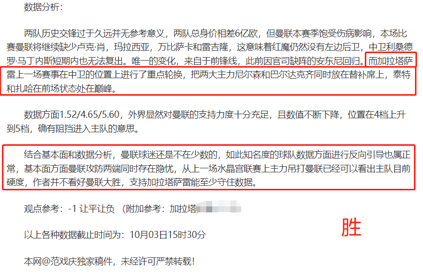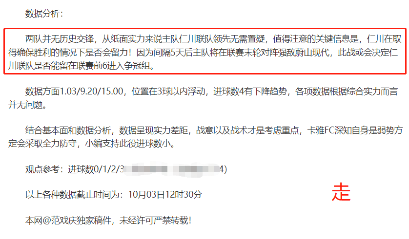 10月分享仅失1场!认真深研,状态保持为大家愉快假期献上祝福~ 昨天第一场作者刨析了曼联明明攻防两难为何却被数据高看,从基本面与数据手法上得出加拉塔萨雷跑出的依据,第二场难度较大,蔚山现代确实未能守住大门罪有应得,第三场也抓住了仁川联队的关键情报,果然46分钟已开始轮换主力,可惜卡雅FC过于糟糕开场5分钟便失守。今天为大家挑选了亚冠和欧冠的赛事!