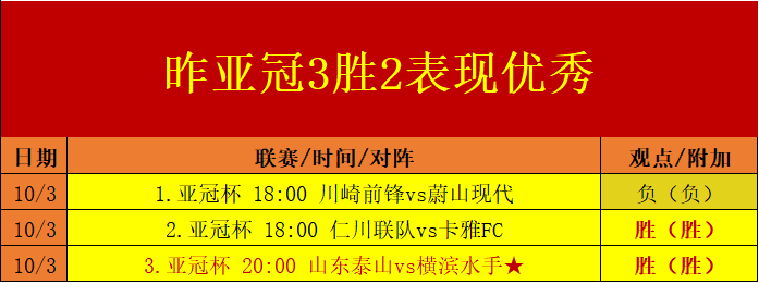 昨日完成的3场亚冠杯比赛取得2场胜利观点分享,其中仁川联队vs卡雅FC的比赛虽然数据开出差距较大但依然能够找准正确方向,作为五星方向支撑的山东泰山vs横滨水手也是承受住了主队方向的压力顺利以胜利方向拿下!本日亚系板块继续精选亚冠杯小组赛事组合,争取携手优势板块对成绩进行修复扩展!