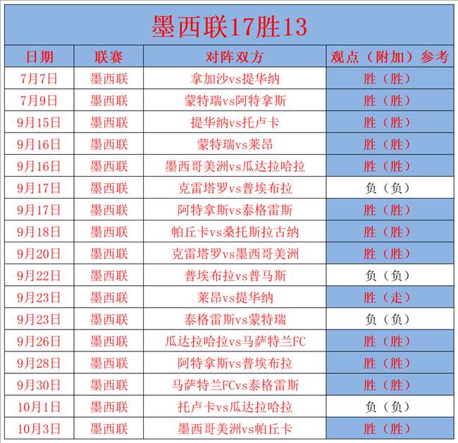 2、近期战绩回顾:昨天3胜2,近期取得4胜3的佳绩,笔者状态逐渐恢复,今天继续追击。今天依旧有笔者熟悉的墨西联,接下来重点分析一场墨西联的比赛,对于墨西联笔者有自己独到的见解,墨西联近期取得17胜13的佳绩,胜率高达76%。