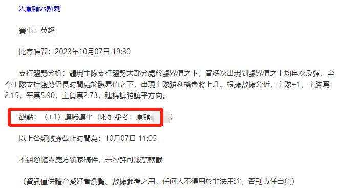 溫馨提示:觀點回顧為已完場賽事的統計,並不能代表未來的觀點預測結果走勢,觀點僅為其個人意見,與本網站無關。資訊僅供體育愛好者瀏覽,並不構成購.彩建議,任何人不得用於非法用途,請廣大用戶理性消費。