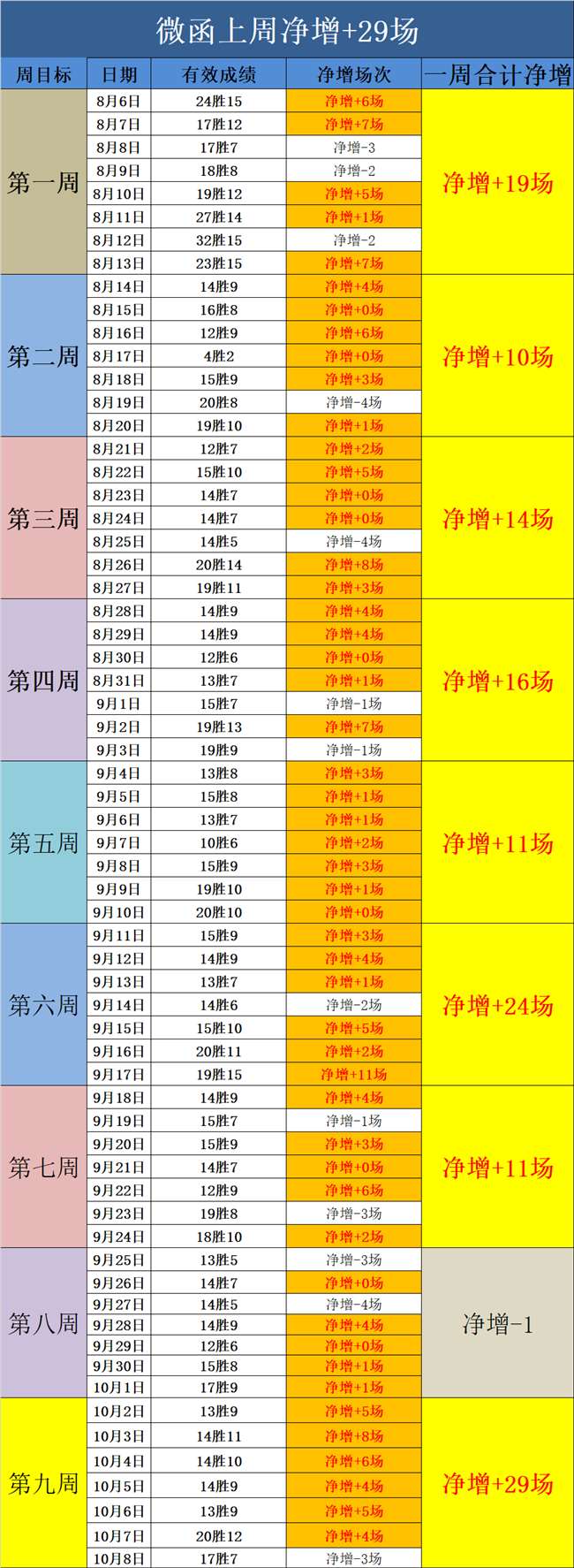 精彩分享:狂胜的一周结束了,上周有效成绩总共是105胜67,净增+29场,截止目前,从8月6日至今,合计已经突破了195场,稳定的状态已经持续了一个多月。