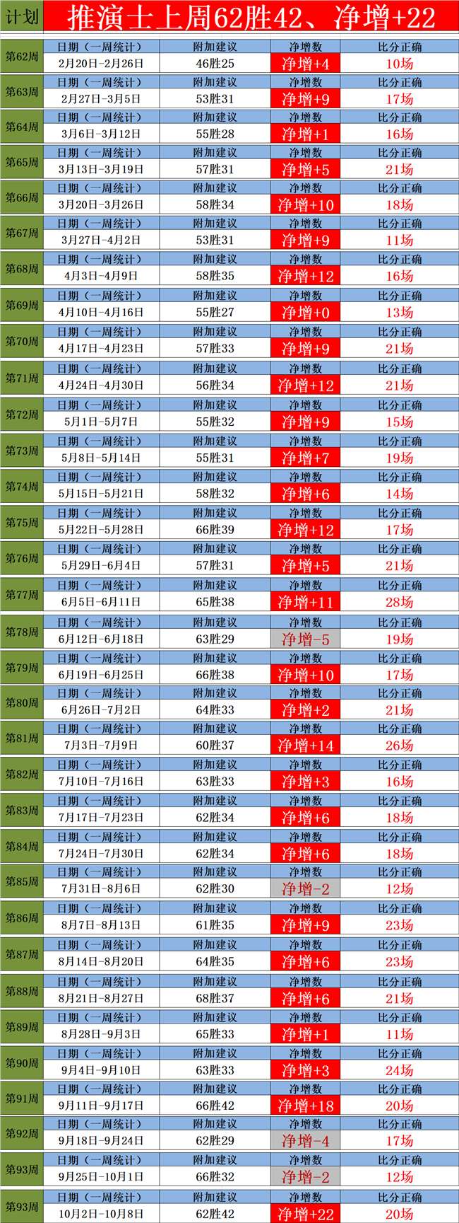 周辉煌战绩(第94周):上周62胜42,净增+22场,击中了20场比分。